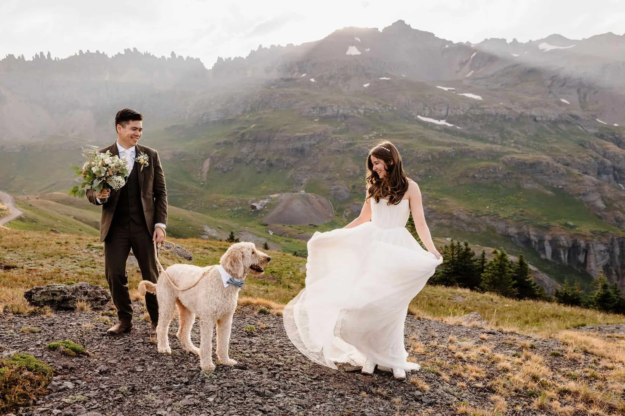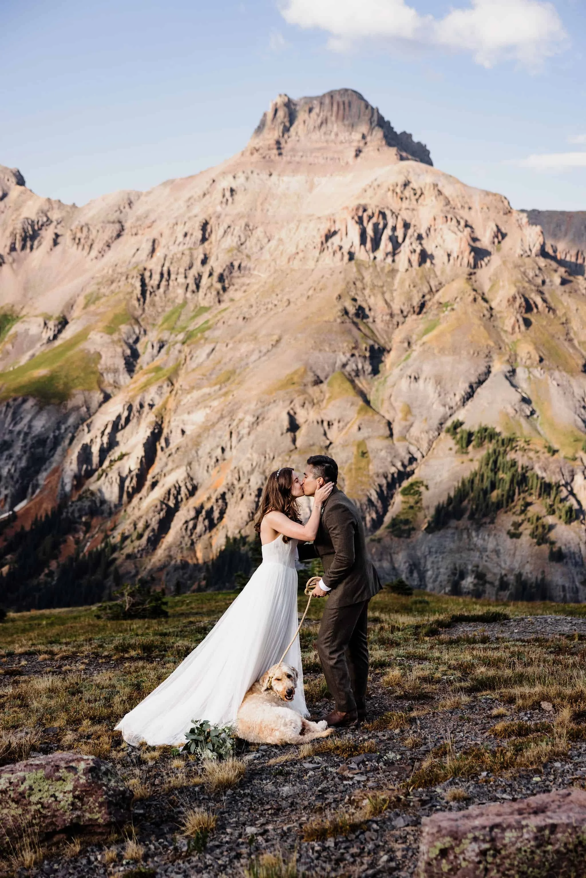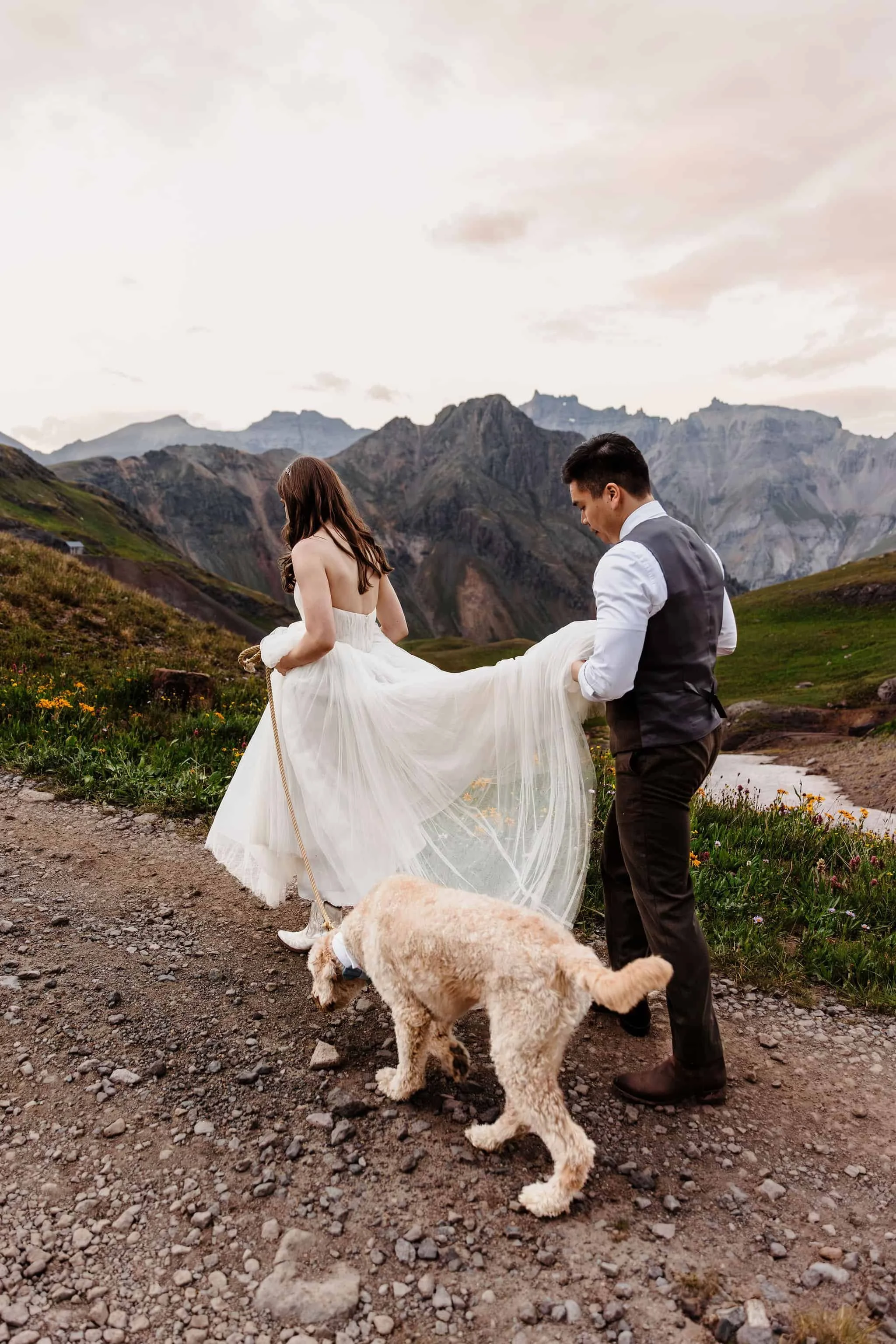 Kelsey and Han met while interning at NASA and bonded over their shared love of dogs, the outdoors, and travel. After getting engaged at the top of Tongariro Crossing in New Zealand, they started exploring options for their wedding. After realizing how much stress is involved with planning a big wedding, they decided to elope in Colorado with just their dog, Blu in attendance, as well as their other two dogs in spirit (Burt stayed home because he doesn’t travel well and Kelsey’s soul dog Bagel who passed away earlier this year).