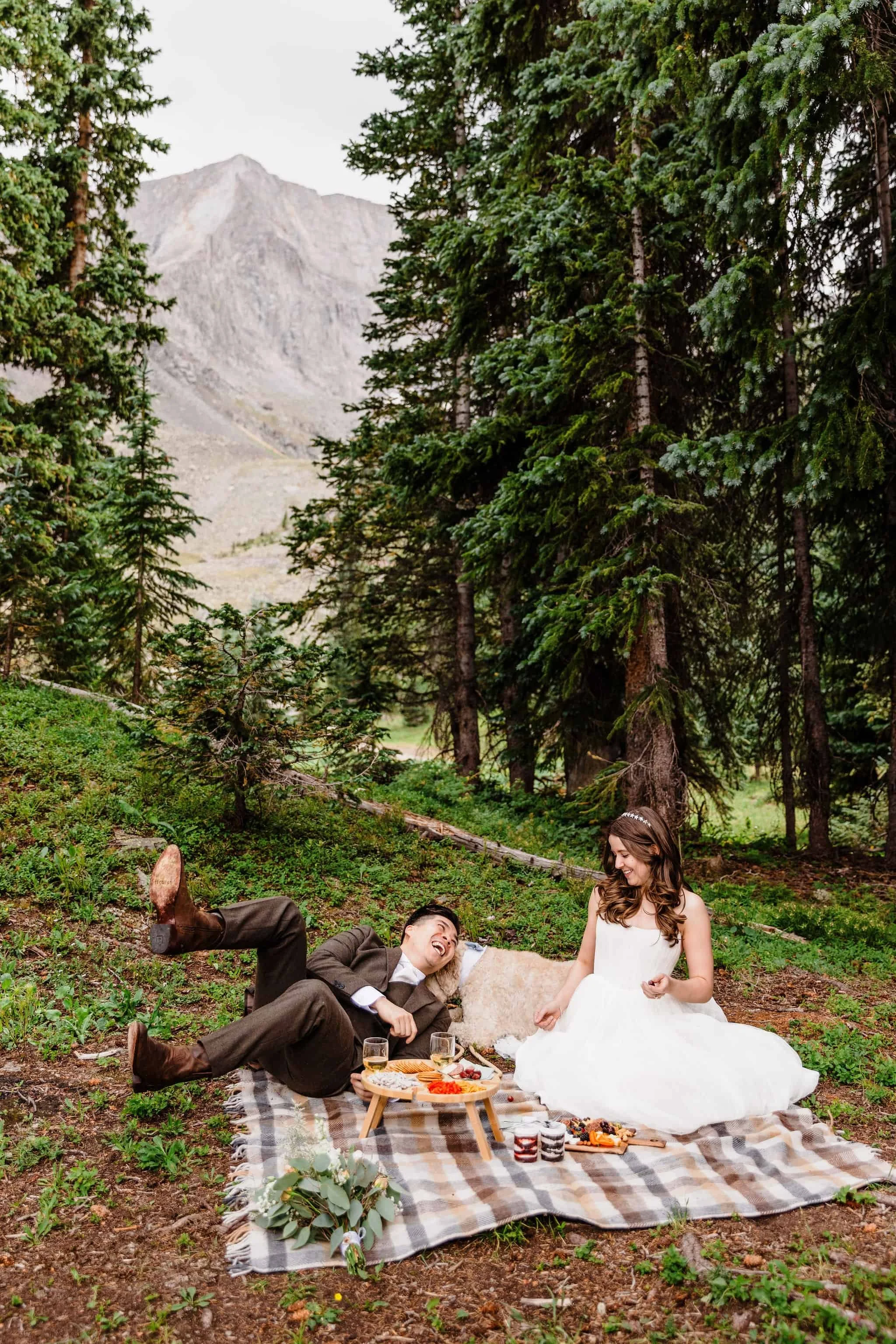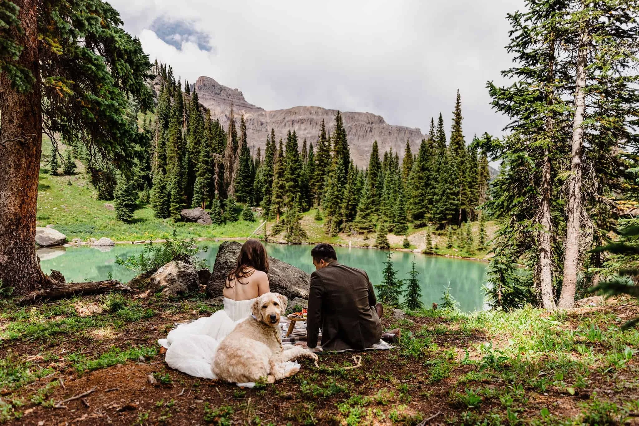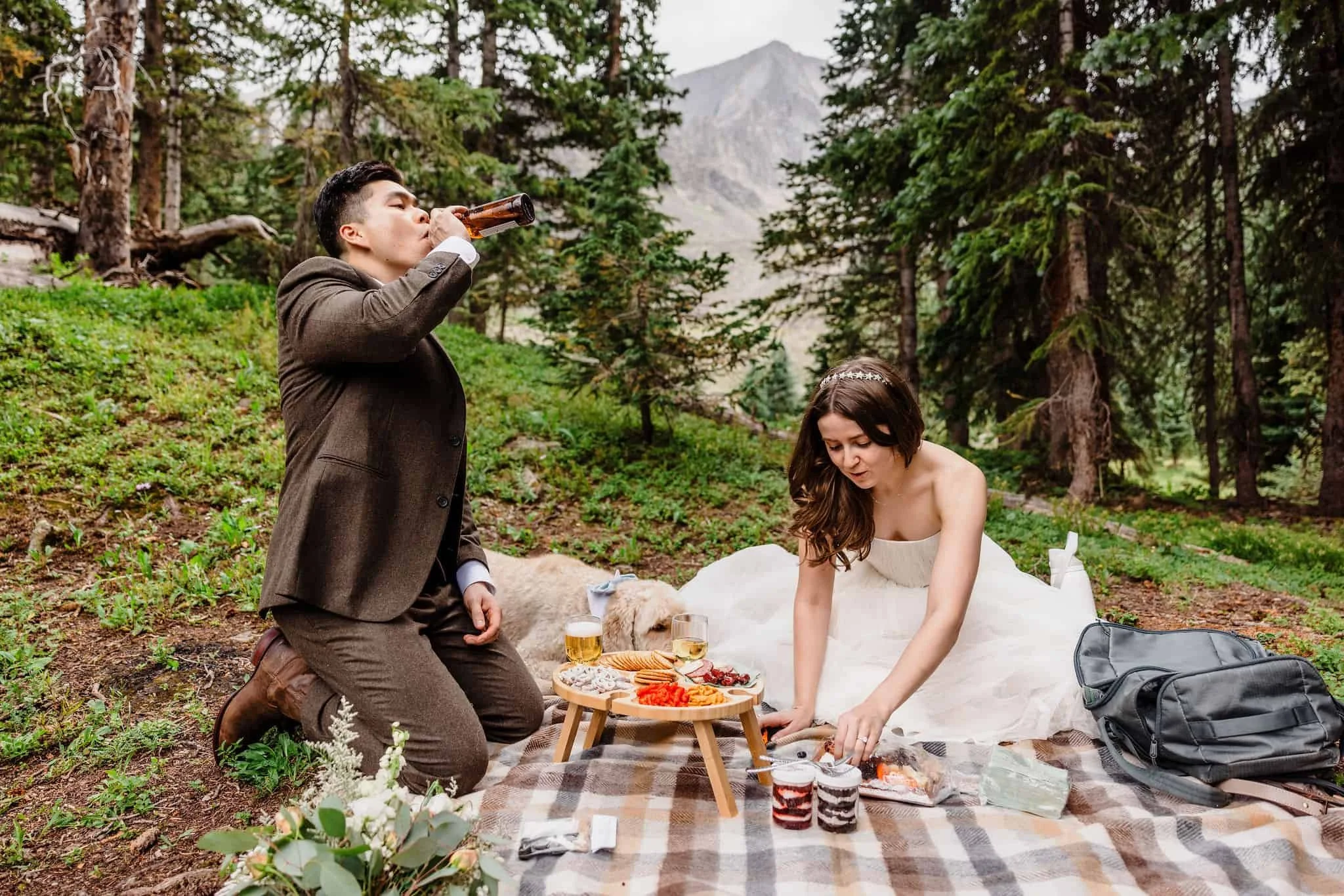 Next, it was time for the most picturesque picnic next to the lake. Kelsey and Han set up a beautiful charcuterie board complete with cheese, meats, their favorite snacks (Flamin’ Hot Cheetos for Han and Goldfish for Kelsey), wedding-themed dog treats for Blue, and even personal cake cups. As they ate, a storm rolled through and it suddenly started pouring rain. They quickly packed up the food and took shelter in the Jeep. But in true Colorado fashion, the storm didn’t last long and soon it was sunny and warm again.