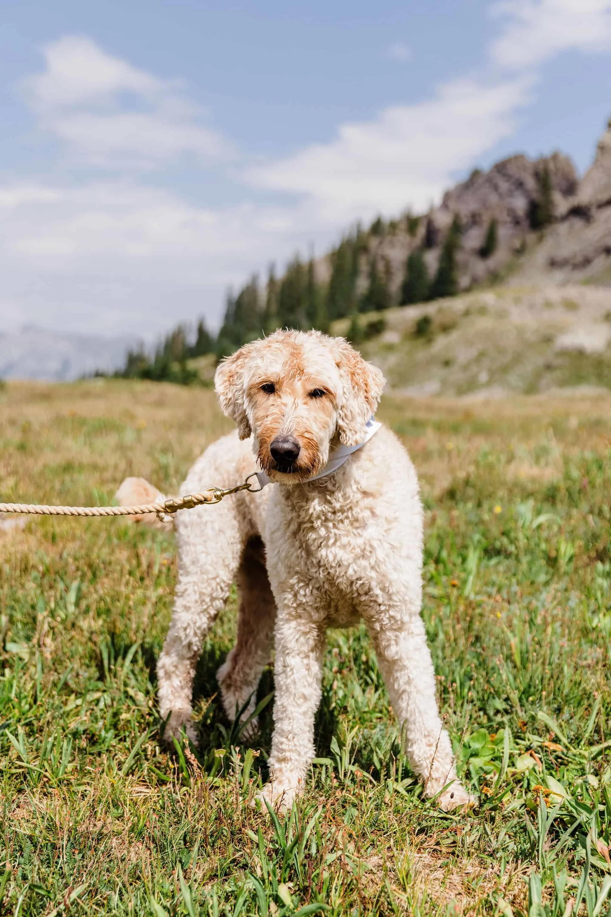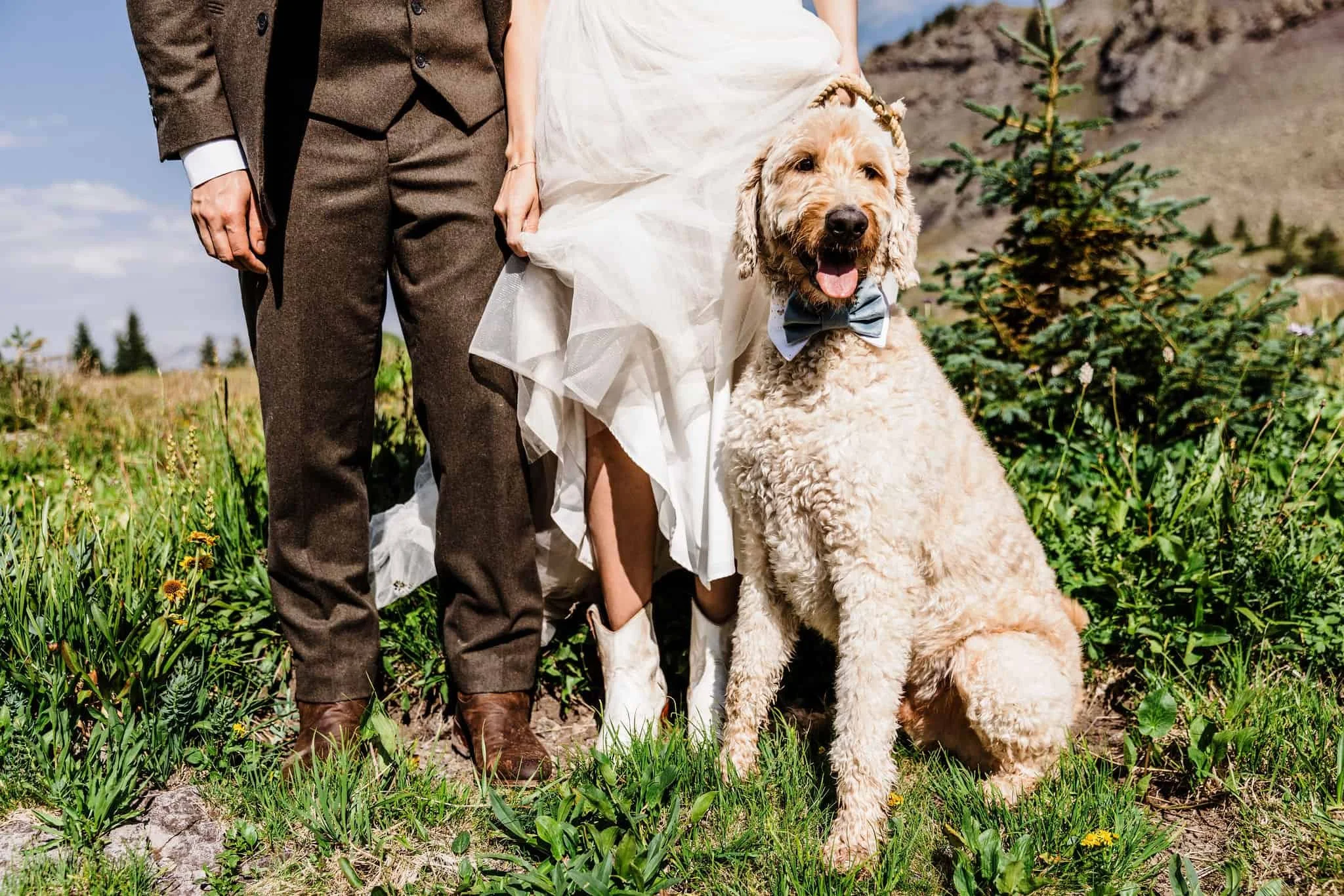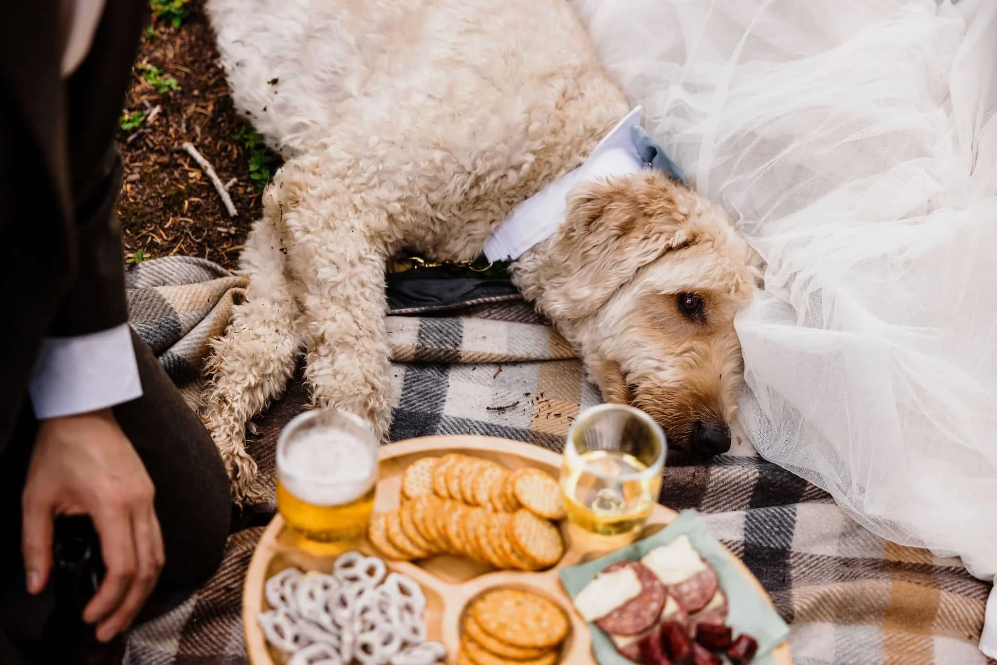 Next, it was time for the most picturesque picnic next to the lake. Kelsey and Han set up a beautiful charcuterie board complete with cheese, meats, their favorite snacks (Flamin’ Hot Cheetos for Han and Goldfish for Kelsey), wedding-themed dog treats for Blue, and even personal cake cups. As they ate, a storm rolled through and it suddenly started pouring rain. They quickly packed up the food and took shelter in the Jeep. But in true Colorado fashion, the storm didn’t last long and soon it was sunny and warm again.