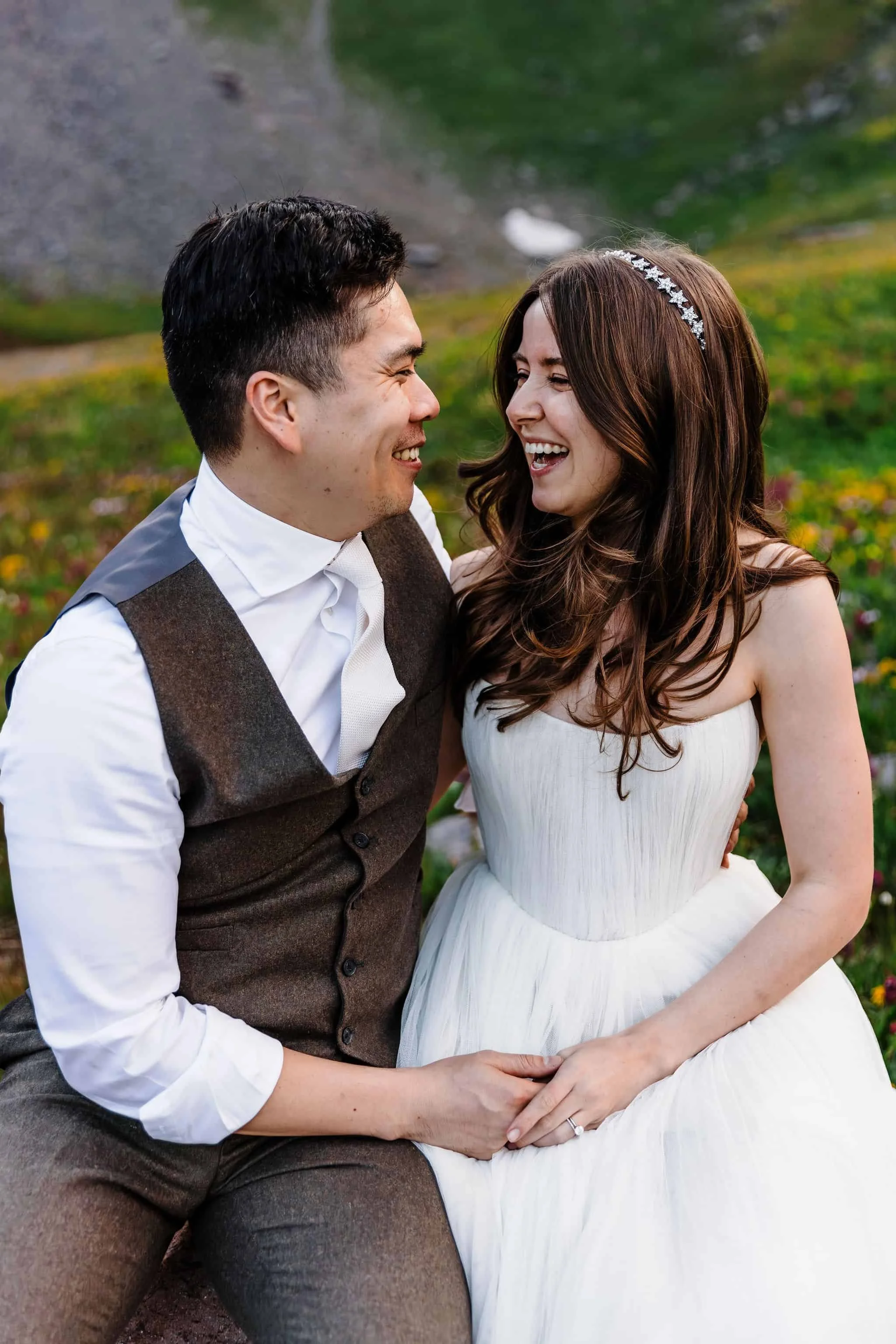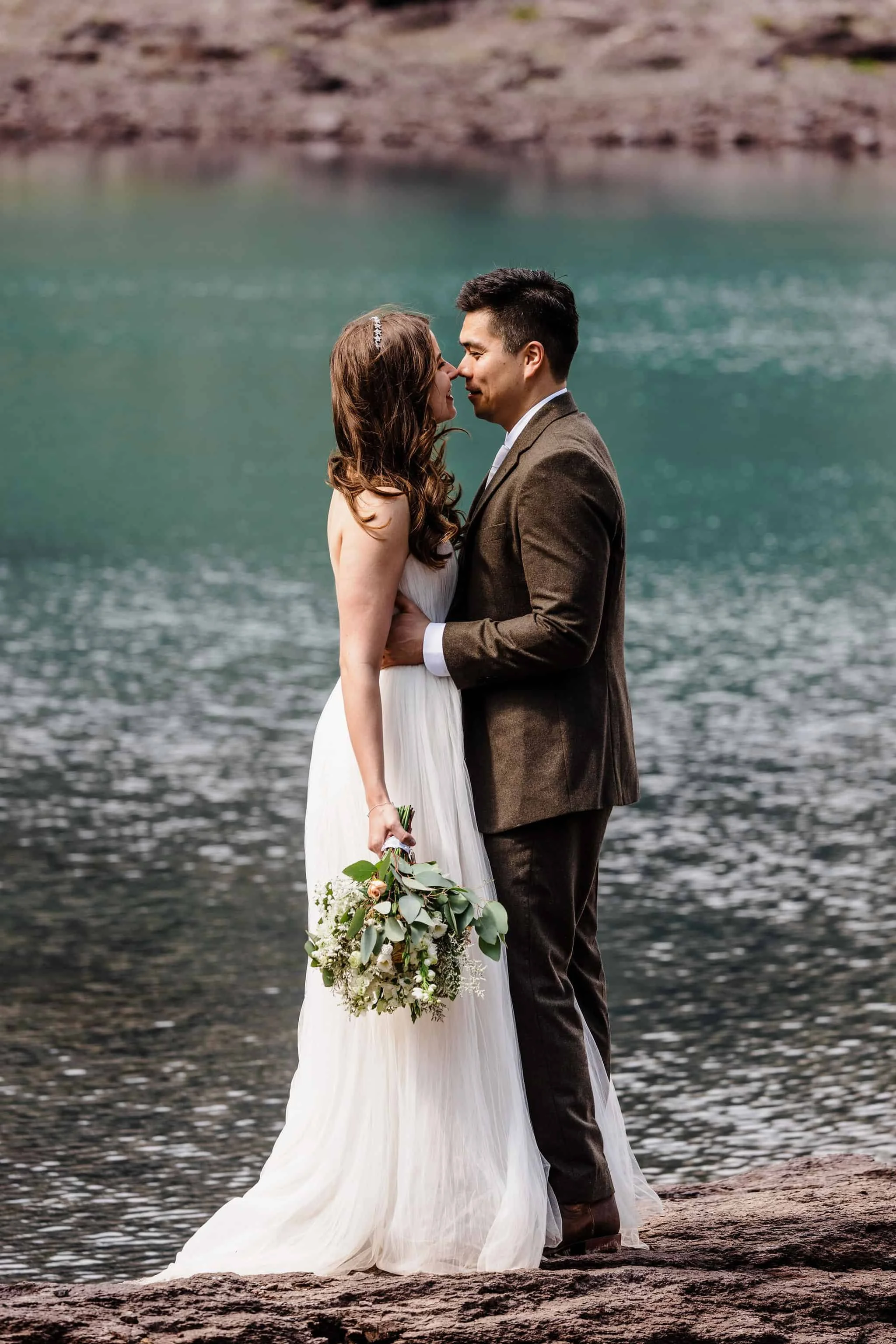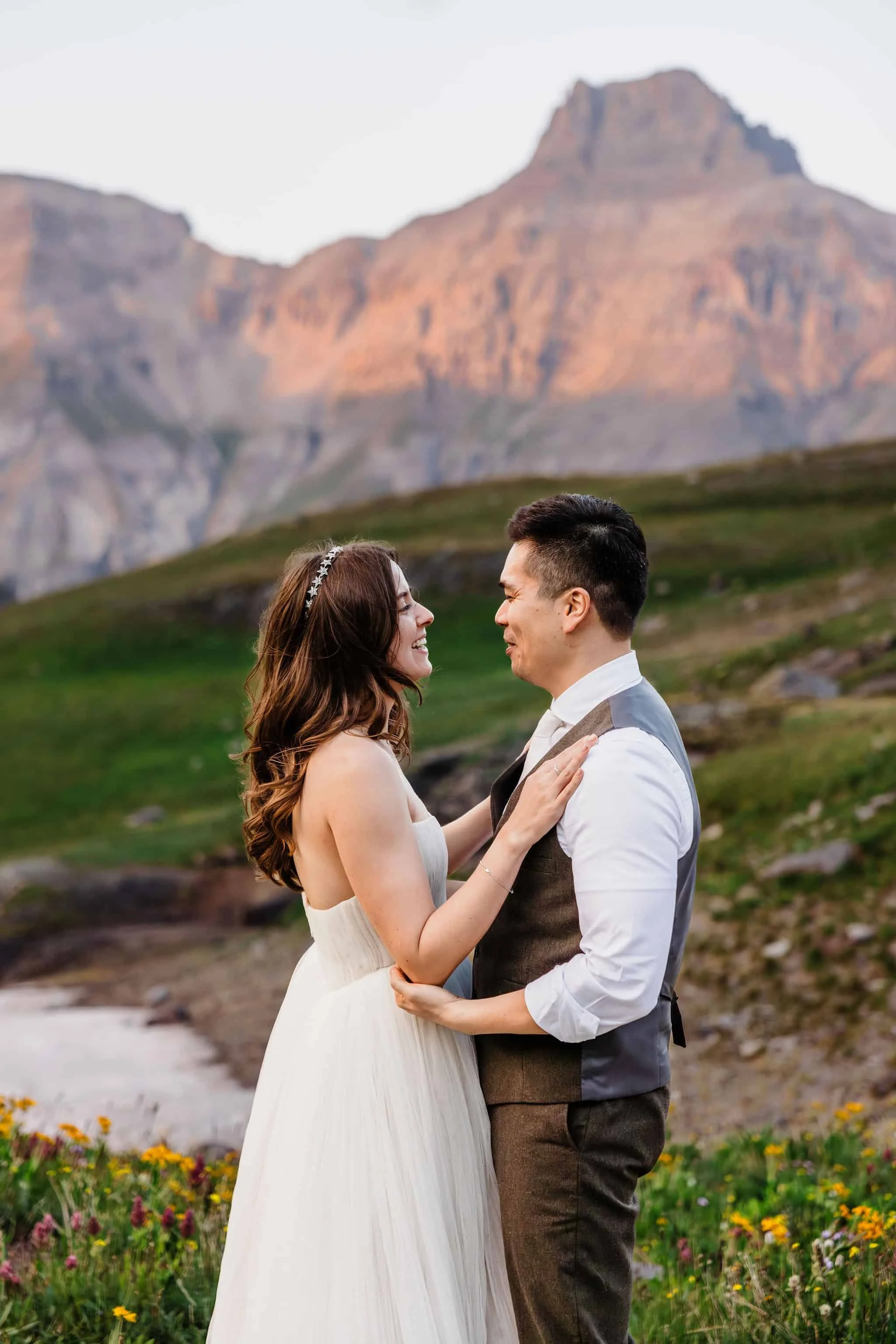 When we arrived at the first alpine lake, we all took a moment to look around. The lake was the most beautiful blue-green color and the hillside was lined with wildflowers. Kelsey and Han both changed into their wedding attire and had their first look down at the edge of the lake.