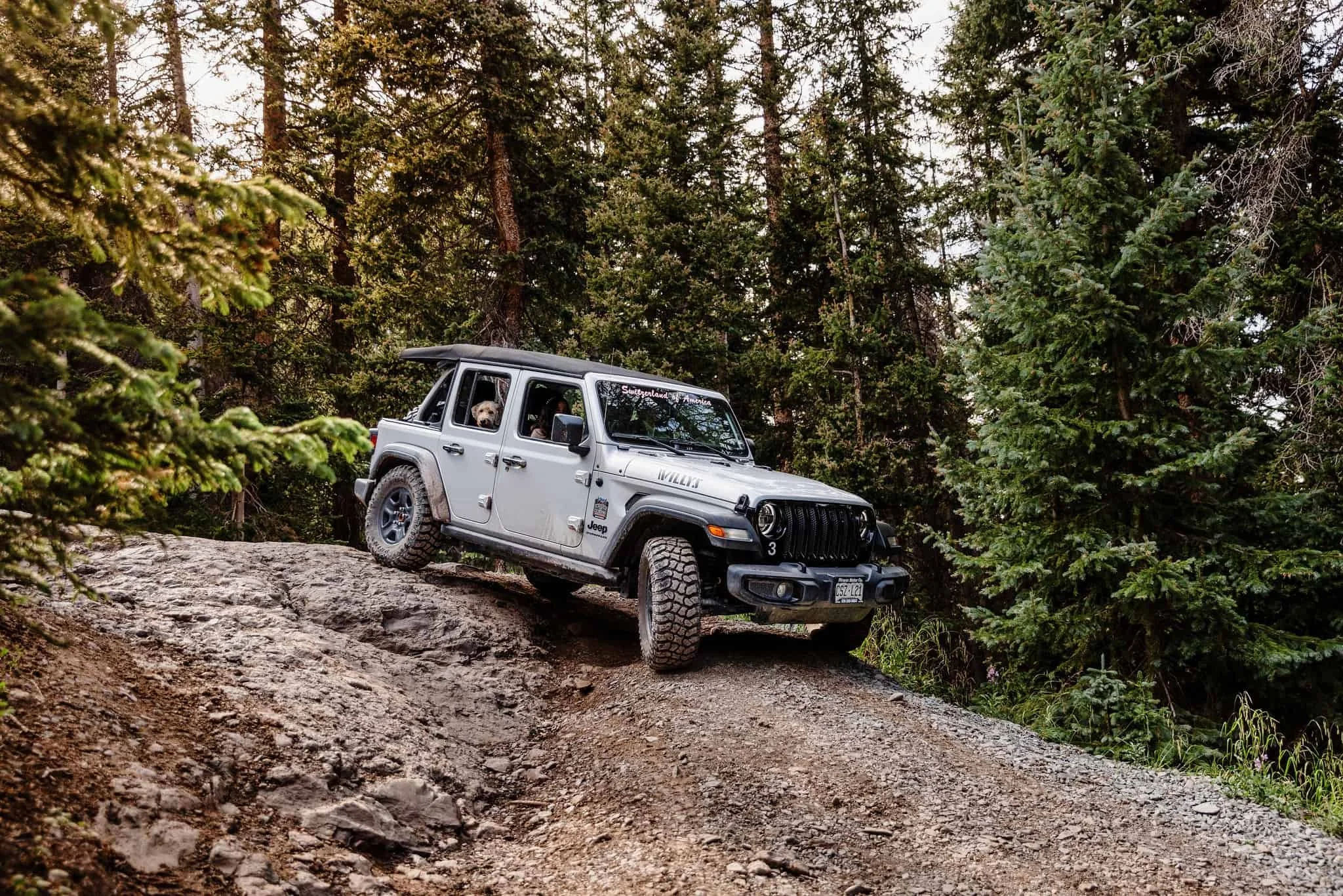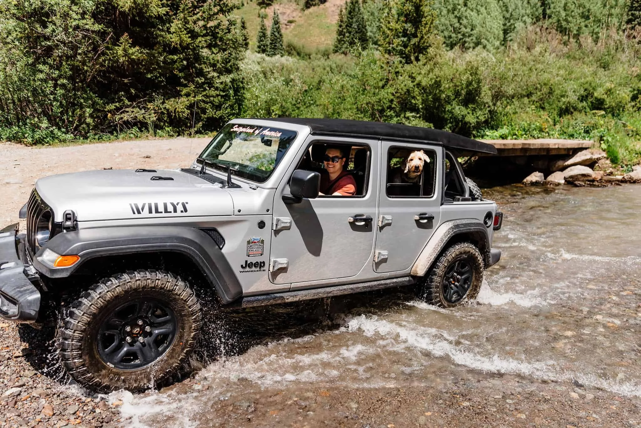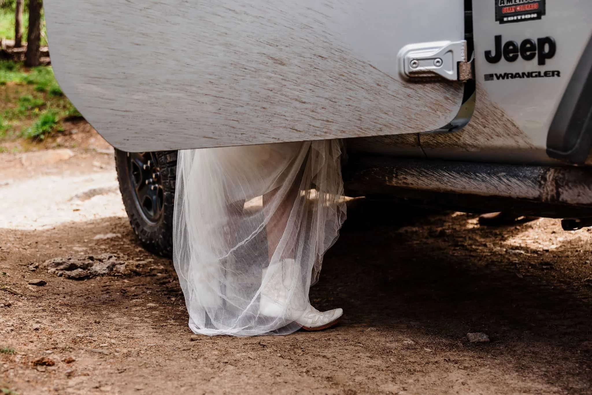 On the afternoon of their elopement, we started their adventure with a steep and bumpy drive up and off-road trail. The location they chose is a little bit more difficult to access and includes a water crossing as well as some areas that require careful tire placement. But Han was up for the challenge and Blu excitedly rode in the backseat and stuck his head out far enough to catch the splashing mud.