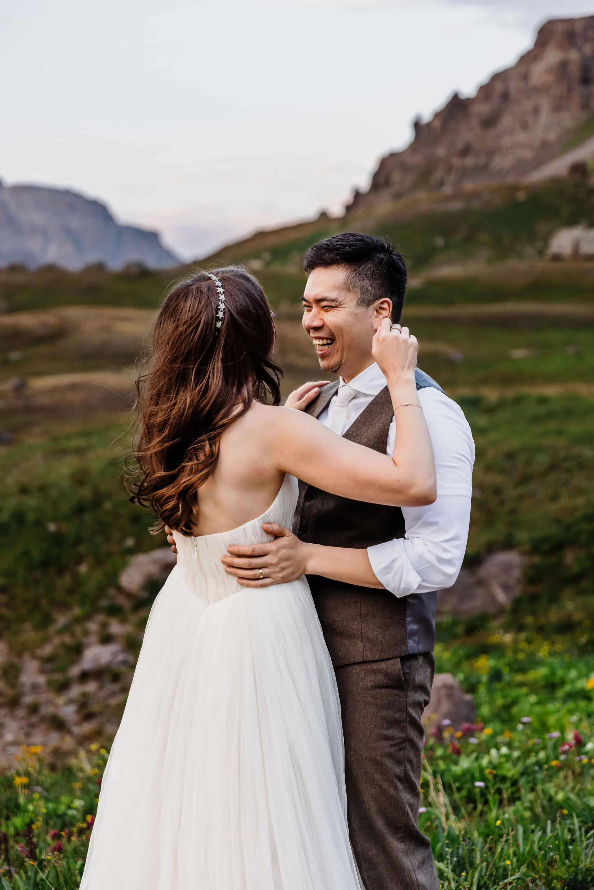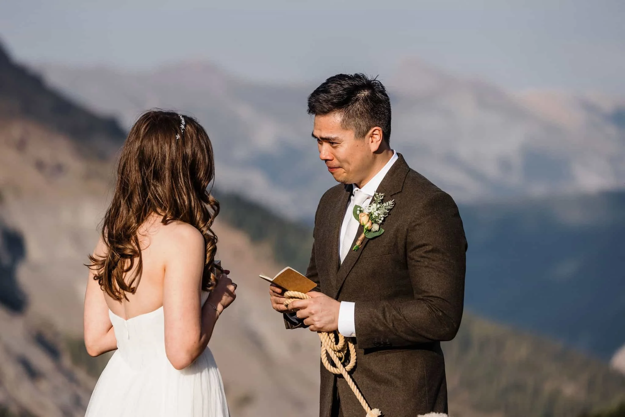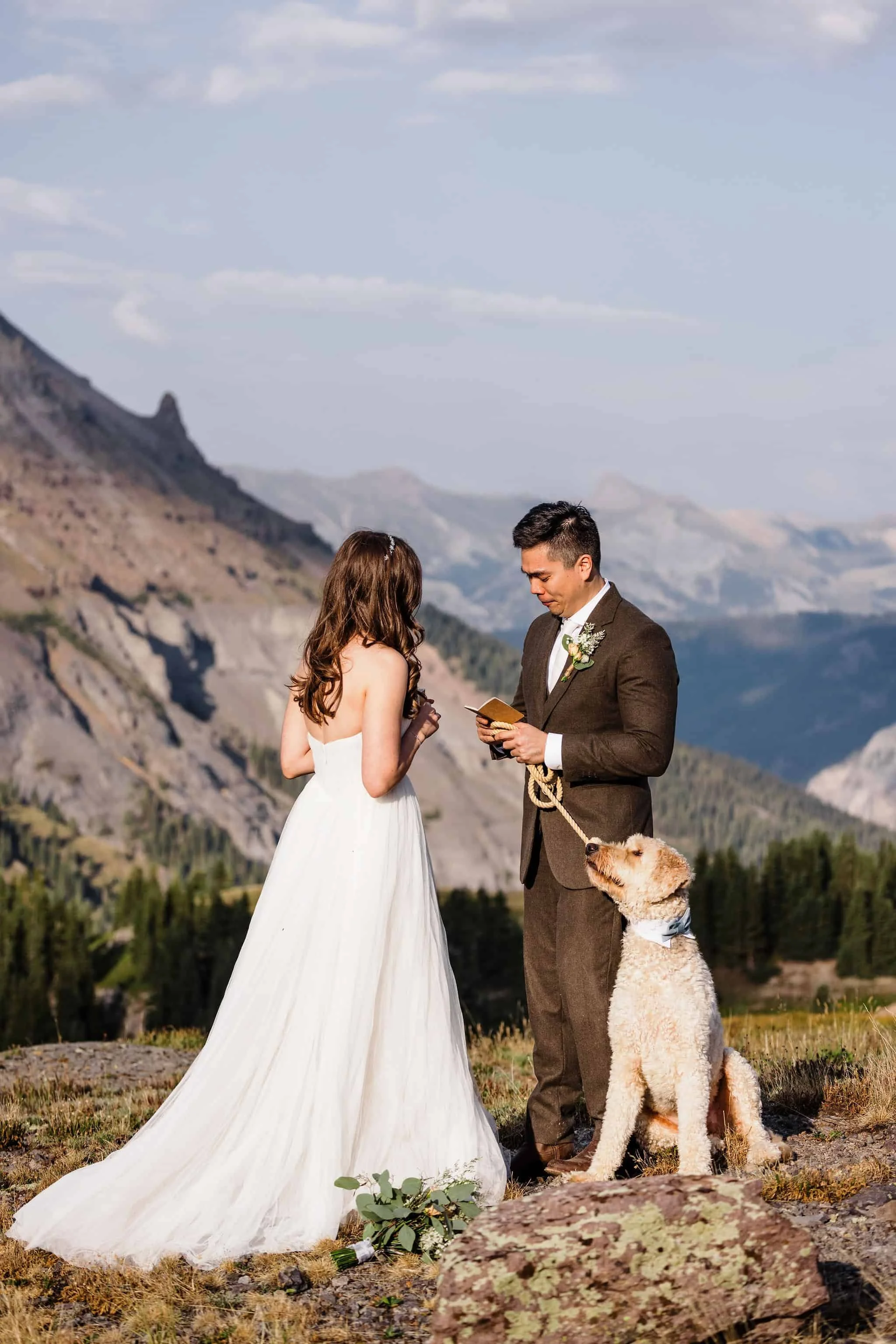Next, we headed to a second alpine lake, this one with grand views of the surrounding mountains. Then, finally, it was time for their ceremony. We drove higher into the mountains to a location with incredible views in all directions. We hiked out to the edge of the mountain and they exchanged their vows with no other people in sight.